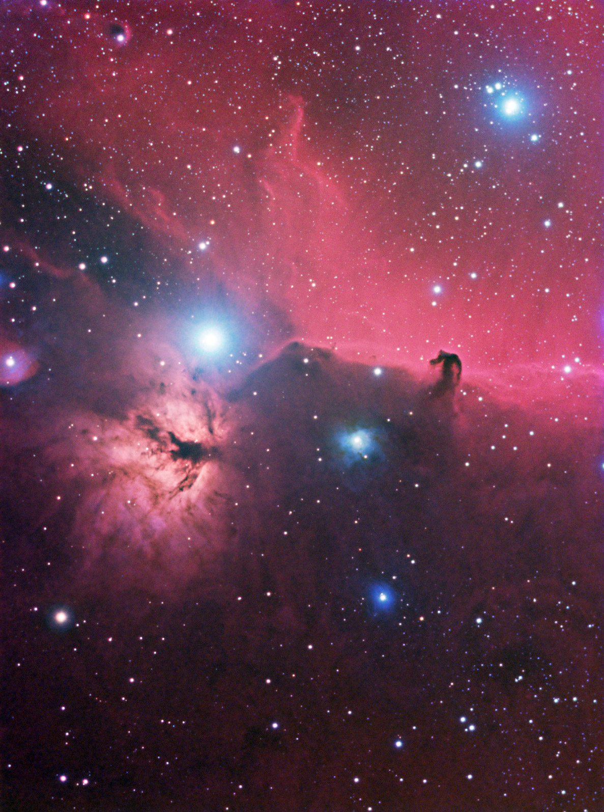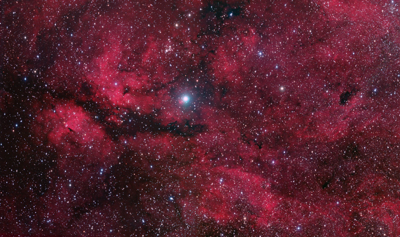 Gamma Cygni (the brightest star near the middle of the image) is so named because it is in the constellation Cygnus. The designation Gamma is meant to indicate the star is the third brightest in the constellation (Gamma being the third letter of the Greek alphabet -Alpha, Beta, Gamma). However, often the designations are not quite right and in this case Gamma Cygni is the second brightest star in the constellation. Cygnus is commonly referred to as the "Northern Cross" and is visible high in the sky around 8pm in the late summer. Face east and look almost directly up. You can see the cross lying on its side with the arm pointing almost up and down. Gamma Cygni is the middle star of the cross, at the point where the two arms meet. Gamma Cygni is approximately 750 light years away. While it is in the middle of this nebular complex, it is actually not associated with the nebula at all. I've seen the nebulosity reported at anywhere from 1500 to 5000 light years distant. Gamma Cygni now happens to line up with the expansive swath of interstellar gas... "IC 1318" is the proper name for the nebulosity just left of Gamma Cygni. Commonly this area is called the Butterfly Nebula. Look carefully and you can see the butterfly - the dark area its body, and the red nebula its wings. This image spans an area of just over 4 degrees wide and almost 2.5 degrees tall. The moon has an average size of 0.5 degrees. That means that if you put the moon on this image and copy it so it covers the entire space, there will be about 40 moons! |