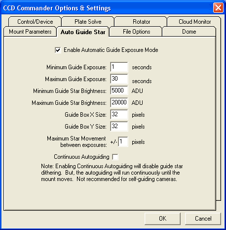 CCD Commander can be configured to automatically find a guide star and automatically determine the ideal guide exposure given whatever imaging configuration you use. Using the parameters you enter, CCD Commander will search the guider image for an appropriate star to guide on - ignoring stars that are too close to the edge or those that have another star near by. CCD Commander will adjust the guide exposure for every Take Image action to achieve the guide star brightness you specify. Remember that brighter stars (with high signal-to-noise) will allow for higher precision centroid calculations. This then allows for higher precision guiding. There is no need to guess at what guide exposures might work for each of your filters. CCD Commander will automatically determine what is necessary. You also don't need to guess what coordinates the guide star will be at. CCD Commander automatically finds the guide star in the image. Coupled with the instrument rotator, the automatic guide star acquisition makes guiding during multi-target imaging a simple task. |